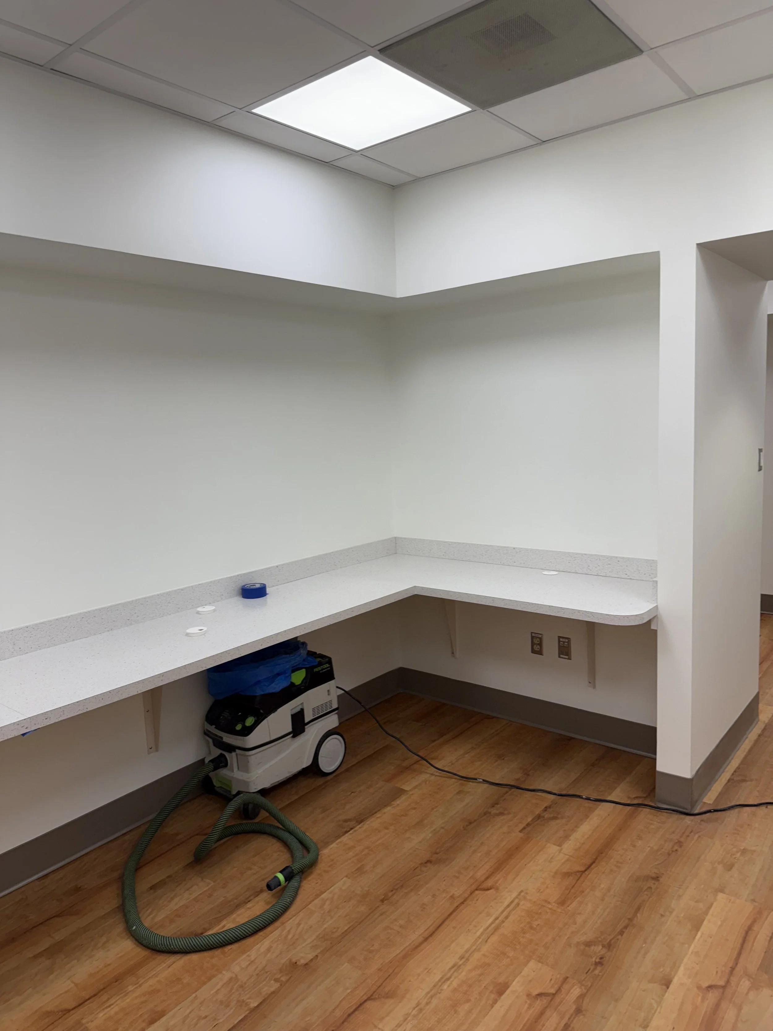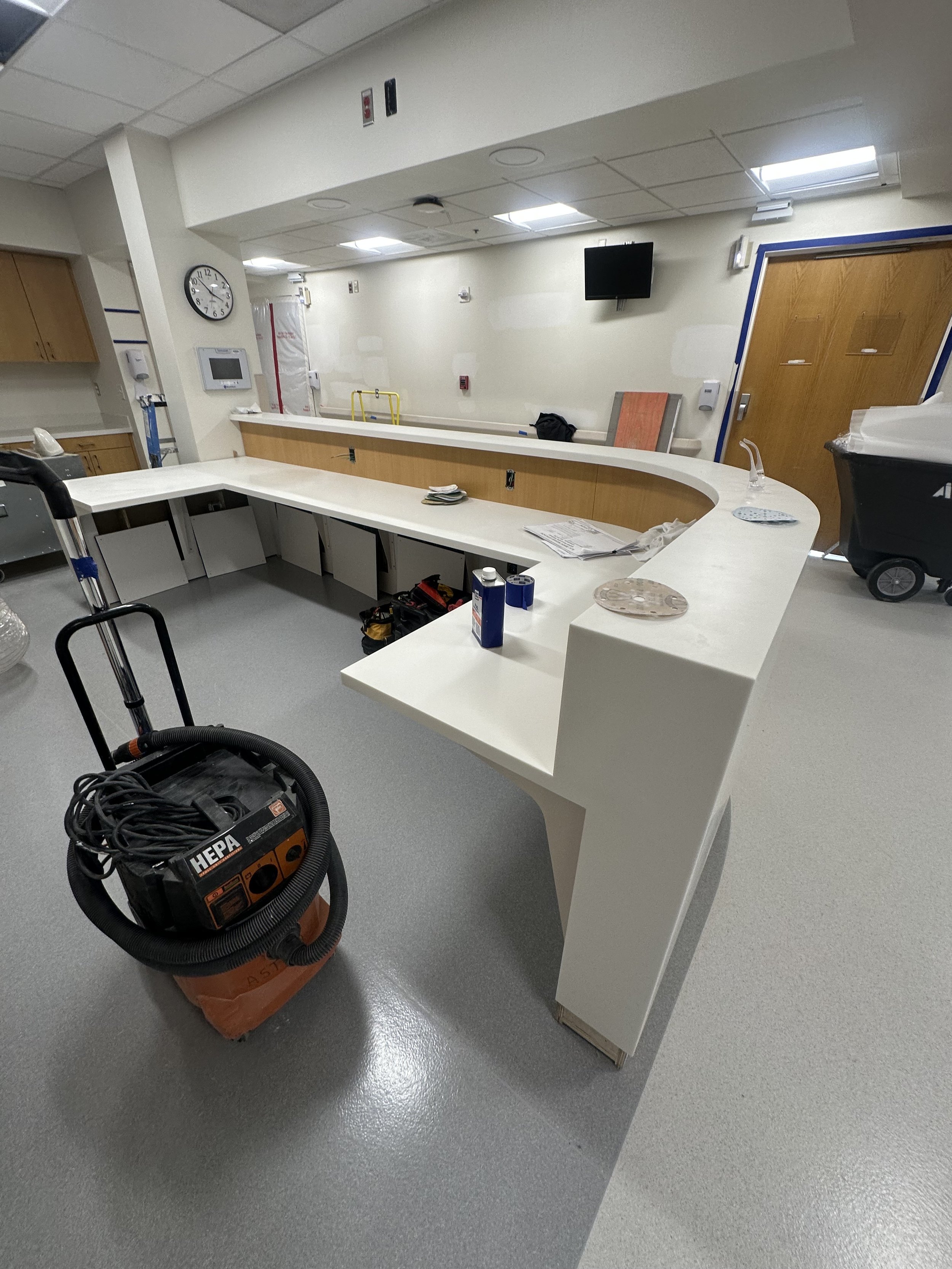 Installation of healthcare-grade cabinetry and solid surface countertops.