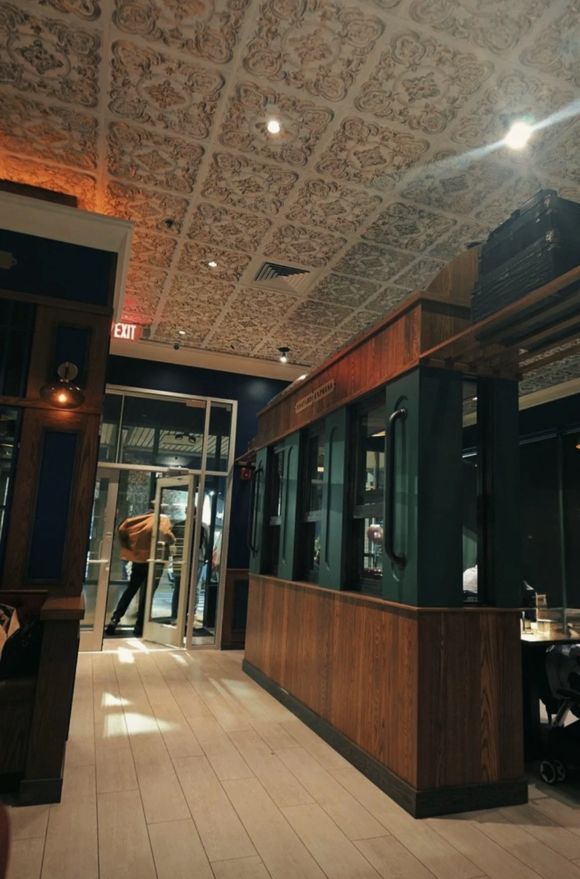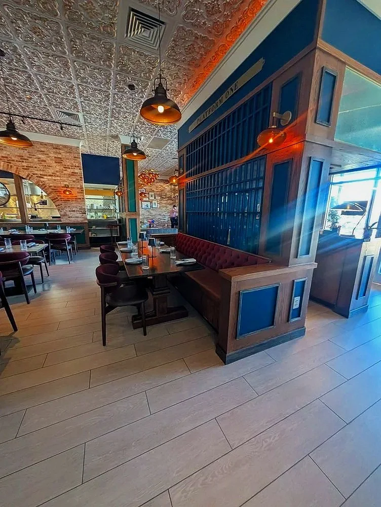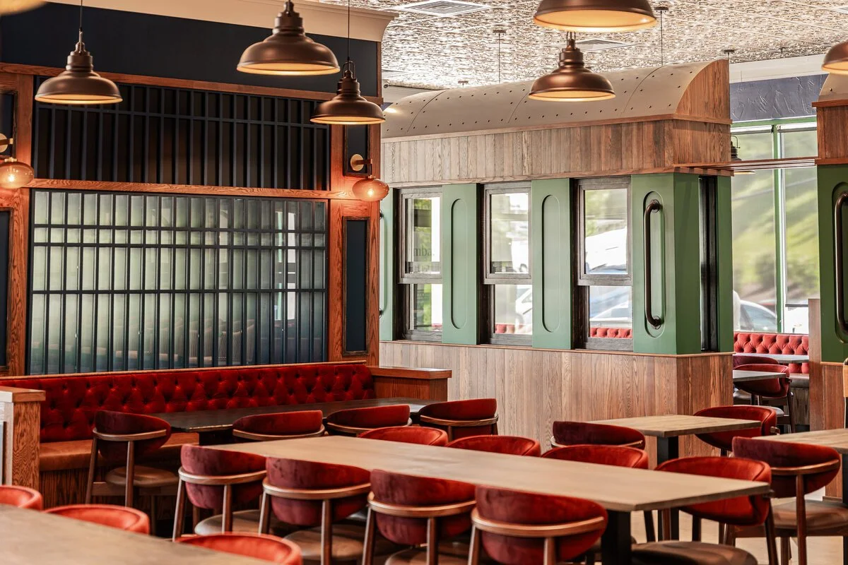 Millwork installation for a full-service restaurant, featuring custom wall panels, banquet, bar millwork, and integrated architectural details.